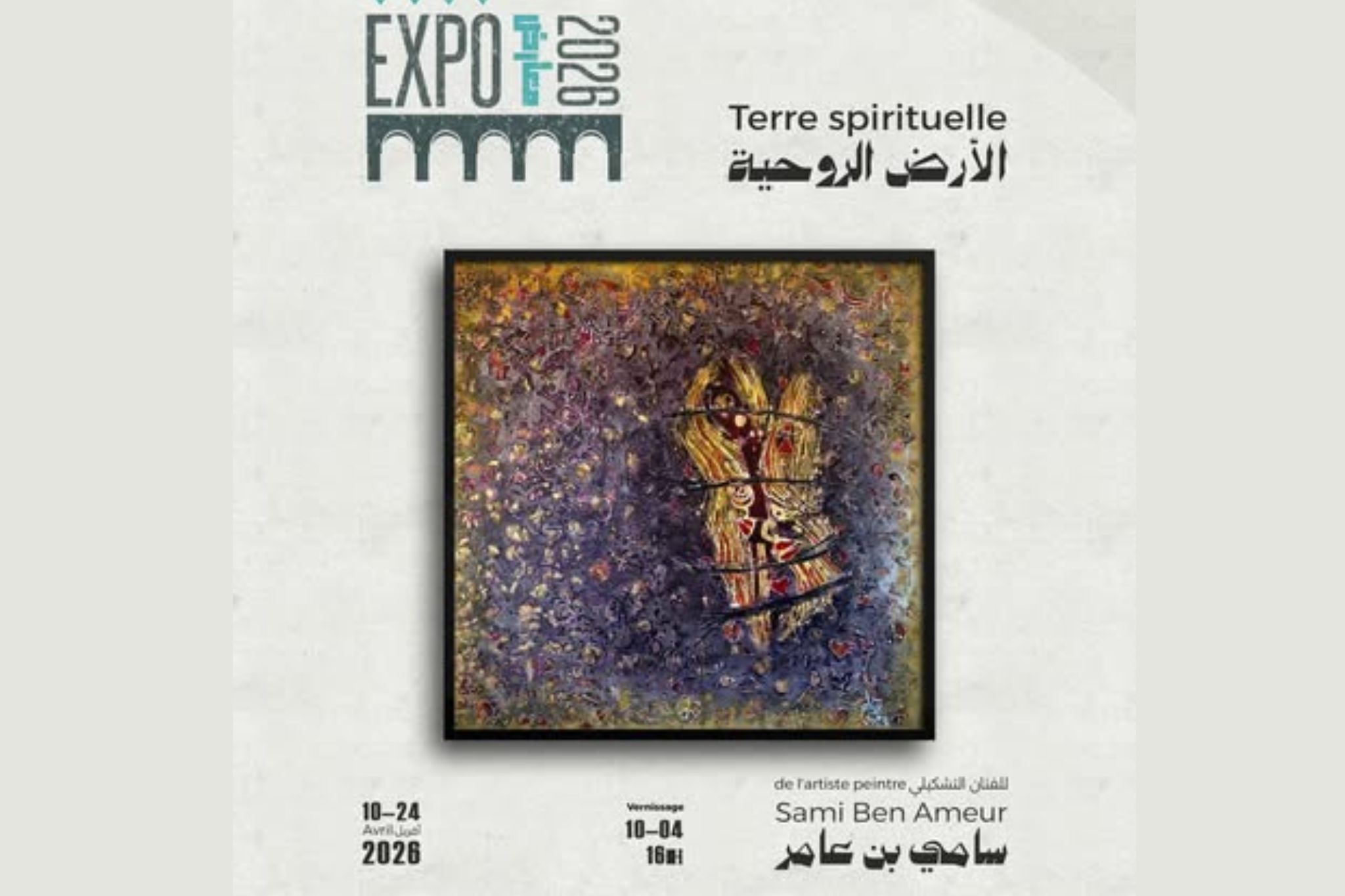 « Terre spirituelle n’est pas seulement une exposition mais un voyage vers la mémoire et les racines. Couleurs et signes s’entrelacées aux blessures du présent, transformant la toile en témoignage et en espérance. Entre terre et esprit naît la question de l’homme, et s’ouvre un nouvel horizon de sens », explique le plasticien dans le catalogue de l’exposition dont le vernissage a eu lieu, vendredi soir, au palais Kheireddine.
