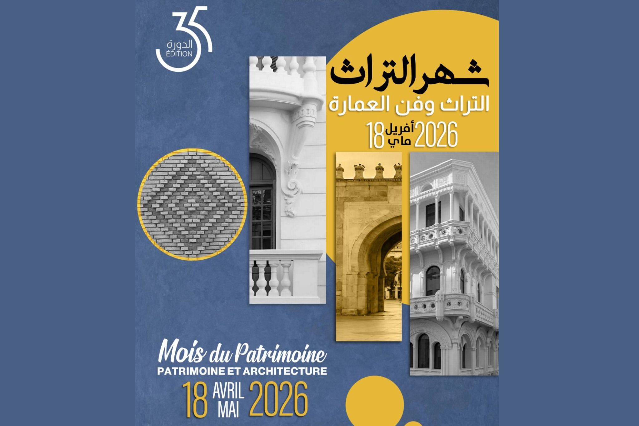 Le ministère des Affaires culturelles a dévoilé l’affiche officielle de la 35ème édition du Mois du Patrimoine, prévue du 18 avril au 18 mai 2026. Placée sous le slogan « Patrimoine et Architecture », cette édition mettra en lumière la richesse et la diversité des styles architecturaux du pays.