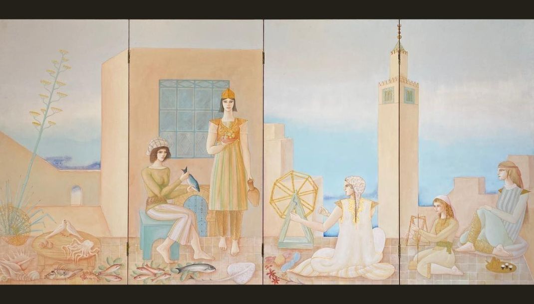L’œuvre est un paravent à quatre panneaux représentant cinq femmes tunisiennes en costumes traditionnels rehaussés de feuilles d’or, bercées dans un décor méditerranéen mêlant artisanat, architecture arabo-andalouse et univers marin. La palette douce d’ocres, de vert d’eau et de roses fumés restitue la lumière des terrasses tunisiennes et la sérénité du littoral.