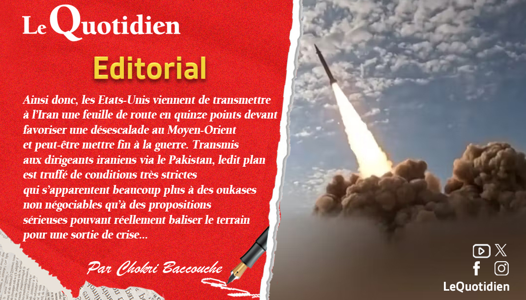 Ainsi donc, les Etats-Unis viennent de transmettre à l’Iran une feuille de route en quinze points devant favoriser une désescalade au Moyen-Orient et peut-être mettre fin à la guerre. Transmis aux dirigeants iraniens via le Pakistan, ledit plan est truffé de conditions très strictes qui s’apparentent beaucoup plus à des oukases non négociables qu’à des propositions sérieuses pouvant réellement baliser le terrain pour une sortie de crise.