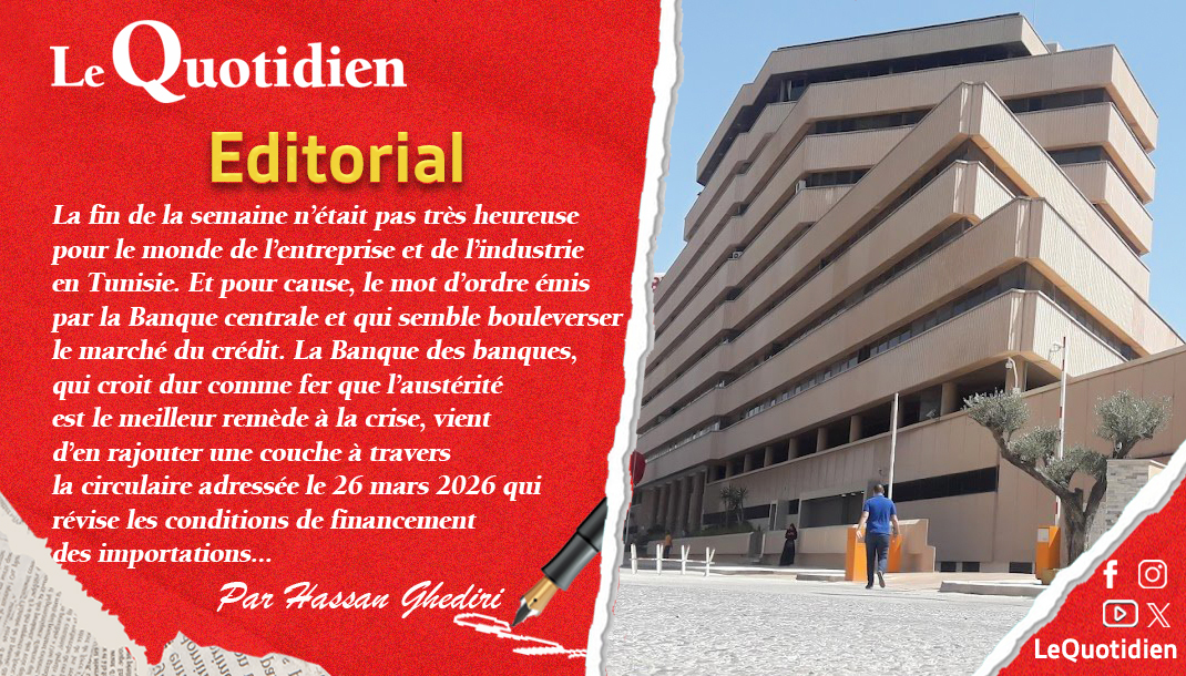 La fin de la semaine n’était pas très heureuse pour le monde de l’entreprise et de l’industrie en Tunisie. Et pour cause, le mot d’ordre émis par la Banque centrale et qui semble bouleverser le marché du crédit. La Banque des banques, qui croit dur comme fer que l’austérité est le meilleur remède à la crise, vient d’en rajouter une couche à travers la circulaire adressée le 26 mars 2026 qui révise les conditions de financement des importations.