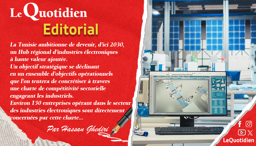 La Tunisie ambitionne de devenir, d’ici 2030, un Hub régional d’industries électroniques à haute valeur ajoutée. Un objectif stratégique se déclinant en un ensemble d’objectifs opérationnels que l’on tentera de concrétiser à travers une charte de compétitivité sectorielle engageant les industriels.