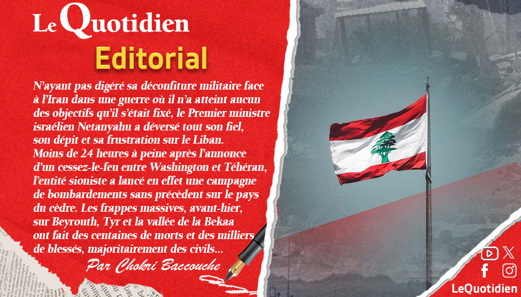 Moins de 24 heures à peine après l’annonce d’un cessez-le-feu entre Washington et Téhéran, l’entité sioniste a lancé en effet une campagne de bombardements sans précèdent sur le pays du cèdre. Les frappes massives, avant-hier, sur Beyrouth, Tyr et la vallée de la Bekaa ont fait des centaines de morts et des milliers de blessés, majoritairement des civils.