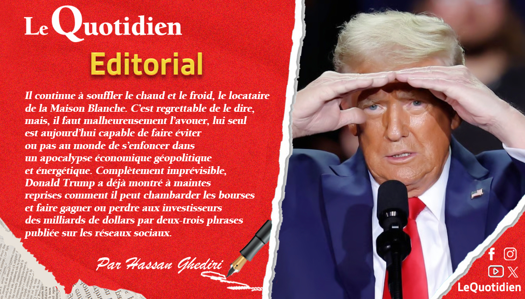 Il continue à souffler le chaud et le froid, le locataire de la Maison Blanche. C’est regrettable de le dire, mais, il faut malheureusement l’avouer, lui seul est aujourd’hui capable de faire éviter ou pas au monde de s’enfoncer dans un apocalypse économique géopolitique et énergétique. Complètement imprévisible, Donald Trump a déjà montré à maintes reprises comment il peut chambarder les bourses et faire gagner ou perdre aux investisseurs des milliards de dollars par deux-trois phrases publiée sur les réseaux sociaux.