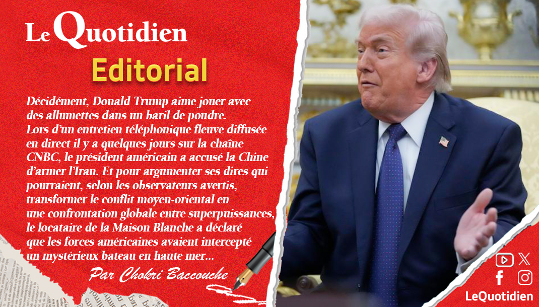 Décidément, Donald Trump aime jouer avec des allumettes dans un baril de poudre. Lors d’un entretien téléphonique fleuve diffusée en direct il y a quelques jours sur la chaîne CNBC, le président américain a accusé la Chine d’armer l’Iran. Et pour argumenter ses dires qui pourraient, selon les observateurs avertis, transformer le conflit moyen-oriental en une confrontation globale entre superpuissances, le locataire de la Maison Blanche a déclaré que les forces américaines avaient intercepté un mystérieux bateau en haute mer.