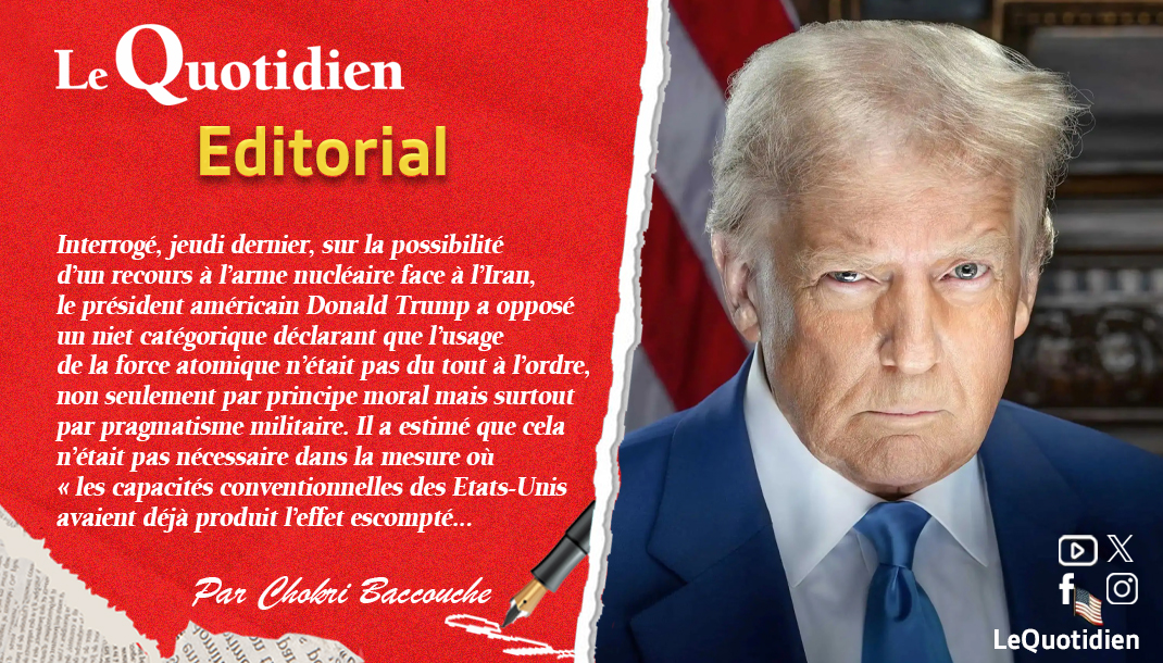 Interrogé, jeudi dernier, sur la possibilité d’un recours à l’arme nucléaire face à l’Iran, le président américain Donald Trump a opposé un niet catégorique déclarant que l’usage de la force atomique n’était pas du tout à l’ordre, non seulement par principe moral mais surtout par pragmatisme militaire. Il a estimé que cela n’était pas nécessaire dans la mesure où « les capacités conventionnelles des Etats-Unis avaient déjà produit l’effet escompté.