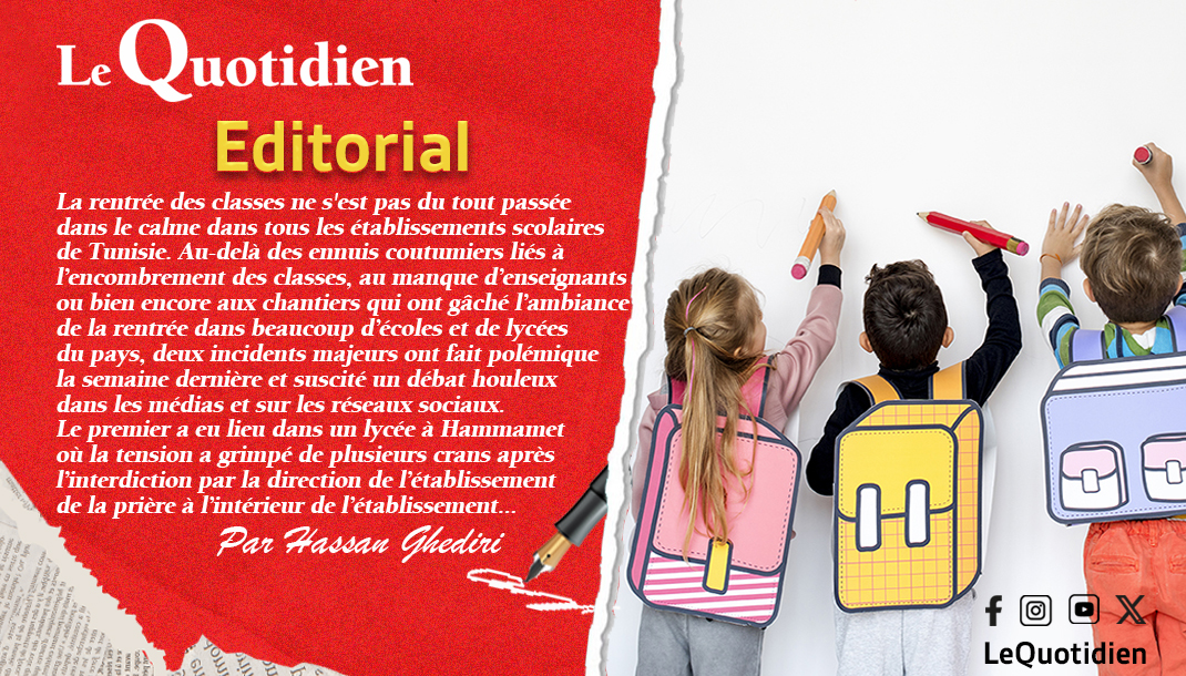 La rentrée des classes ne s'est pas du tout passée dans le calme dans tous les établissements scolaires de Tunisie. Au-delà des ennuis coutumiers liés à l’encombrement des classes, au manque d’enseignants ou bien encore aux chantiers qui ont gâché l’ambiance de la rentrée dans beaucoup d’écoles et de lycées du pays, deux incidents majeurs ont fait polémique la semaine dernière et suscité un débat houleux dans les médias et sur les réseaux sociaux. Le premier a eu lieu dans un lycée à Hammamet où la tension a grimpé de plusieurs crans après l’interdiction par la direction de l’établissement de la prière à l’intérieur de l’établissement. Un groupe d’élèves qui était en train d’effectuer la prière dans les vestiaires a été forcé de quitter les lieux et de s’engager à ne plus prier à l’intérieur du lycée. L’affaire a vite fait boule de neige divisant l’opinion publique sur la bonne manière de gérer la pratique religieuse au sein des établissements éducatifs. Le deuxième incident a commencé par une simple mésentente entre la directrice d’un lycée à Nabeul et la mère d’une élève exclue pour avoir manqué de discipline en classe. Les choses ont mal tourné par la suite avec une levée de bouclier d’un grand nombre d’élèves apparus dans une vidéo partagée sur Facebook en train de scander des slogans contre la directrice de leur lycée et demandant sa destitution.