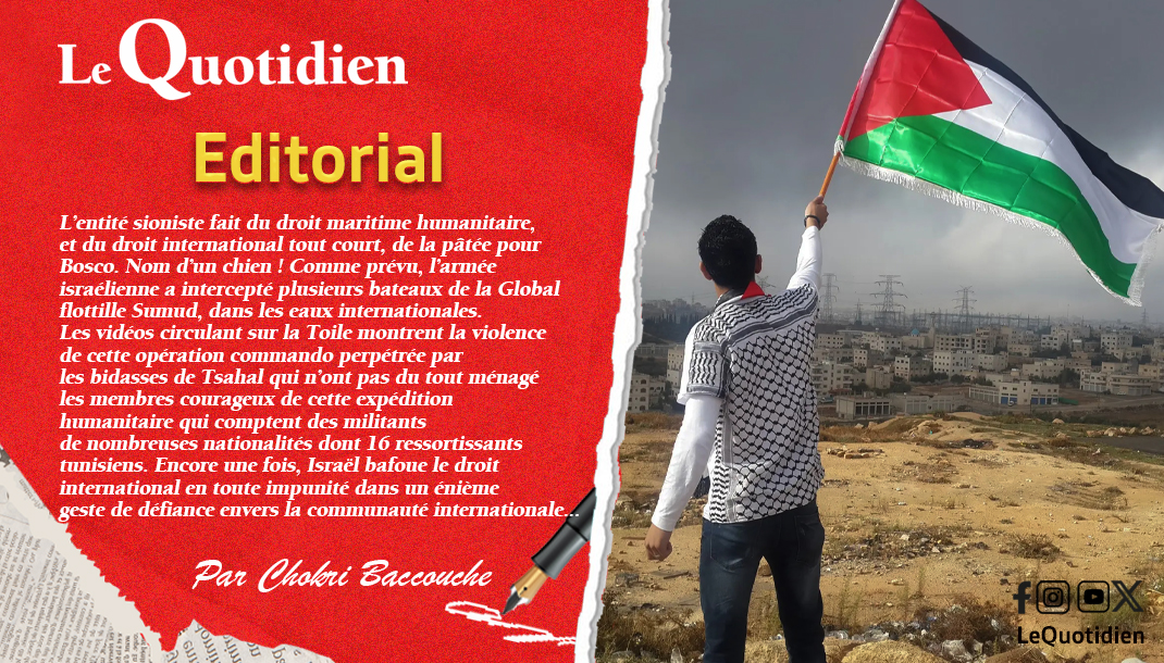 L’entité sioniste fait du droit maritime humanitaire, et du droit international tout court, de la pâtée pour Bosco. Nom d’un chien ! Comme prévu, l’armée israélienne a intercepté plusieurs bateaux de la Global flottille Sumud, dans les eaux internationales. Les vidéos circulant sur la Toile montrent la violence de cette opération commando perpétrée par les bidasses de Tsahal qui n’ont pas du tout ménagé les membres courageux de cette expédition humanitaire qui comptent des militants de nombreuses nationalités dont 16 ressortissants tunisiens. Encore une fois, Israël bafoue le droit international en toute impunité dans un énième geste de défiance envers la communauté internationale.