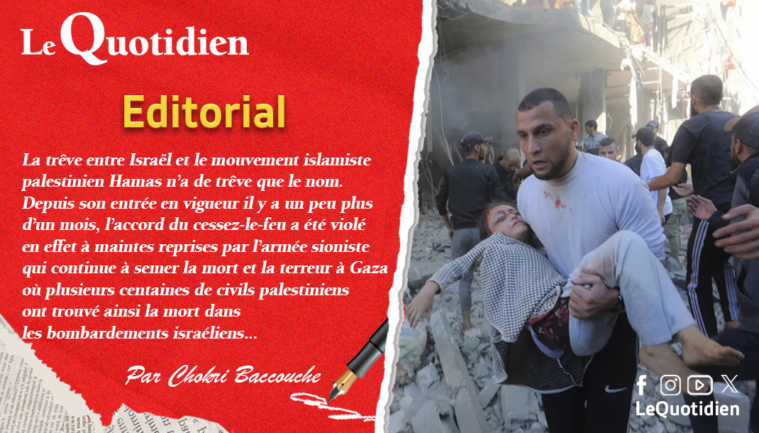 La trêve entre Israël et le mouvement islamiste palestinien Hamas n’a de trêve que le nom. Depuis son entrée en vigueur il y a un peu plus d’un mois, l’accord du cessez-le-feu a été violé en effet à maintes reprises par l’armée sioniste qui continue à semer la mort et la terreur à Gaza où plusieurs centaines de civils palestiniens ont trouvé ainsi la mort dans les bombardements israéliens.