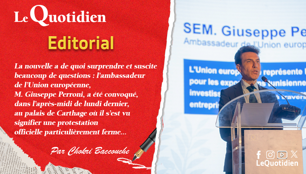 La nouvelle a de quoi surprendre et suscite beaucoup de questions : l’ambassadeur de l’Union européenne, M. Giuseppe Perroni, a été convoqué, dans l’après-midi de lundi dernier, au palais de Carthage où il s’est vu signifier une protestation officielle particulièrement ferme.