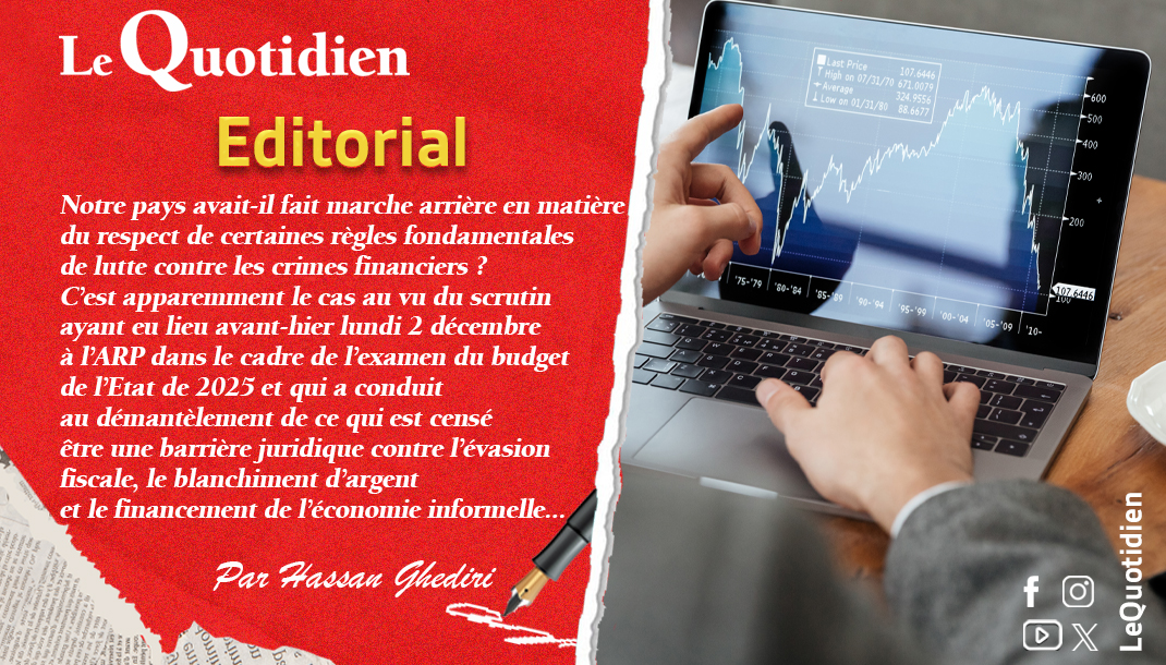 Notre pays avait-il fait marche arrière en matière du respect de certaines règles fondamentales de lutte contre les crimes financiers ? C’est apparemment le cas au vu du scrutin ayant eu lieu avant-hier lundi 2 décembre à l’ARP dans le cadre de l’examen du budget de l’Etat de 2025 et qui a conduit au démantèlement de ce qui est censé être une barrière juridique contre l’évasion fiscale, le blanchiment d’argent et le financement de l’économie informelle.