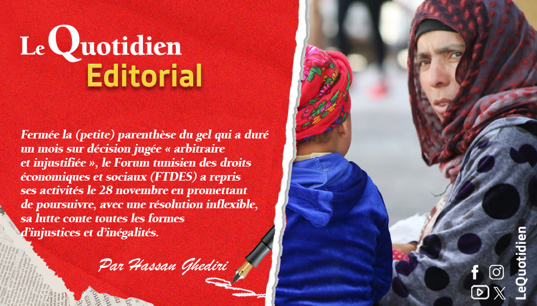 Fermée la (petite) parenthèse du gel qui a duré un mois sur décision jugée « arbitraire et injustifiée », le Forum tunisien des droits économiques et sociaux (FTDES) a repris ses activités le 28 novembre en promettant de poursuivre, avec une résolution inflexible, sa lutte conte toutes les formes d’injustices et d’inégalités.