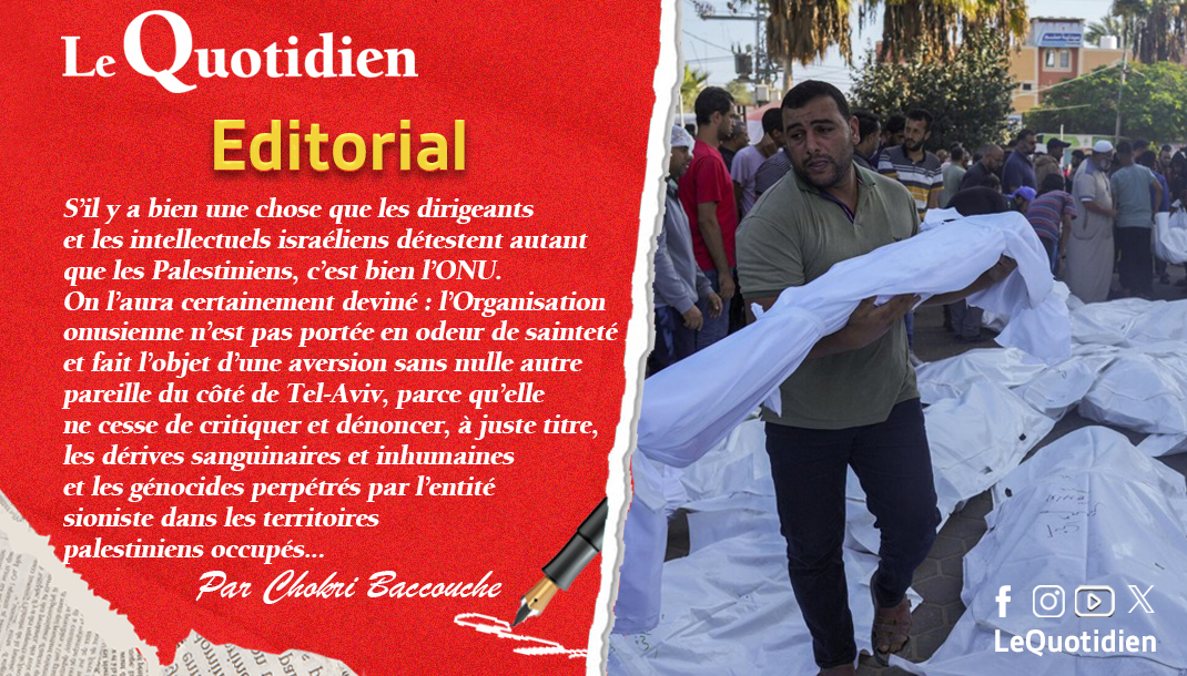 S’il y a bien une chose que les dirigeants et les intellectuels israéliens détestent autant que les Palestiniens, c’est bien l’ONU. On l’aura certainement deviné : l’Organisation onusienne n’est pas portée en odeur de sainteté et fait l’objet d’une aversion sans nulle autre pareille du côté de Tel-Aviv, parce qu’elle ne cesse de critiquer et dénoncer, à juste titre, les dérives sanguinaires et inhumaines et les génocides perpétrés par l’entité sioniste dans les territoires palestiniens occupés.