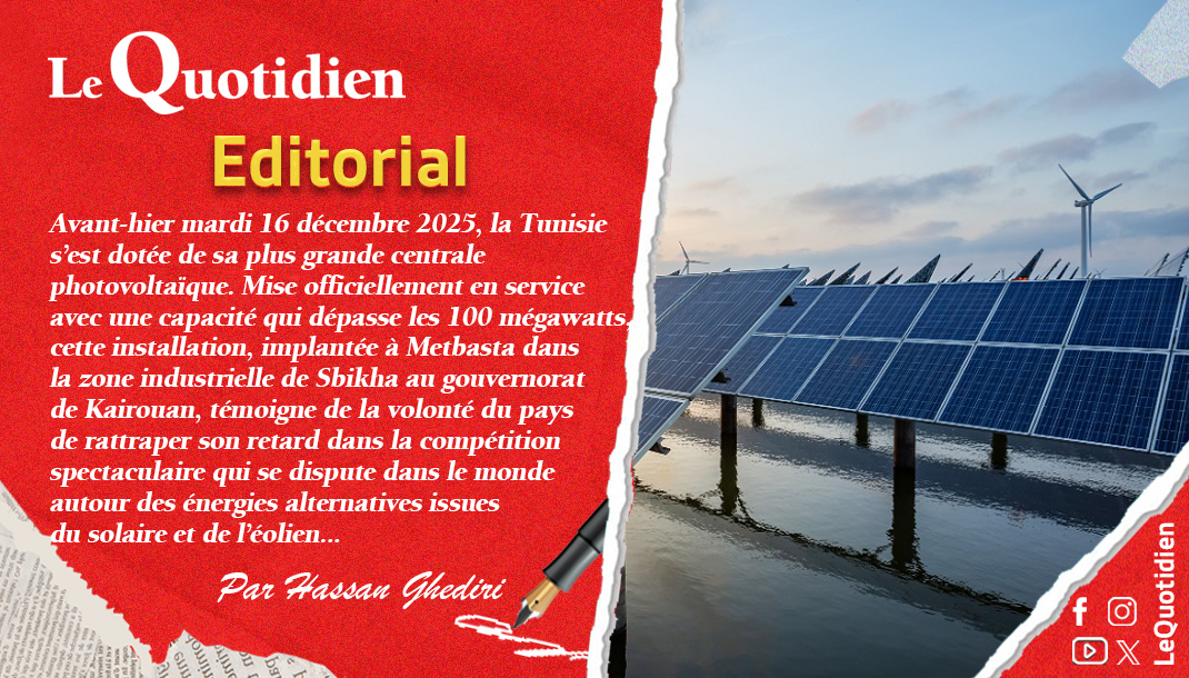 Avant-hier mardi 16 décembre 2025, la Tunisie s’est dotée de sa plus grande centrale photovoltaïque. Mise officiellement en service avec une capacité qui dépasse les 100 mégawatts, cette installation, implantée à Metbasta dans la zone industrielle de Sbikha au gouvernorat de Kairouan, témoigne de la volonté du pays de rattraper son retard dans la compétition spectaculaire qui se dispute dans le monde autour des énergies alternatives issues du solaire et de l’éolien.