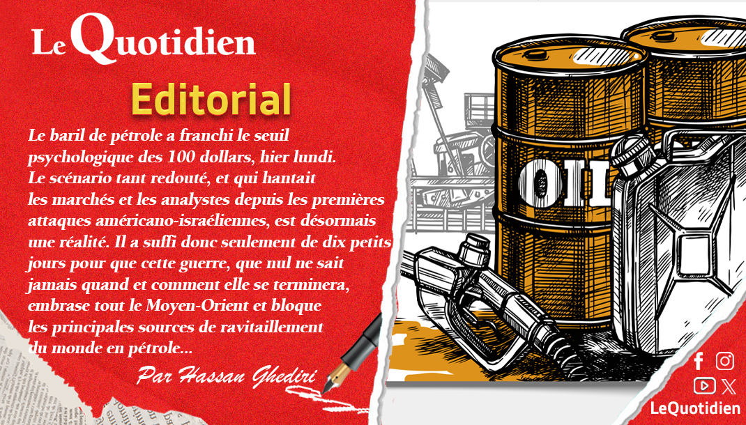 Le baril de pétrole a franchi le seuil psychologique des 100 dollars, hier lundi. Le scénario tant redouté, et qui hantait les marchés et les analystes depuis les premières attaques américano-israéliennes, est désormais une réalité. Il a suffi donc seulement de dix petits jours pour que cette guerre, que nul ne sait jamais quand et comment elle se terminera, embrase tout le Moyen-Orient et bloque les principales sources de ravitaillement du monde en pétrole.