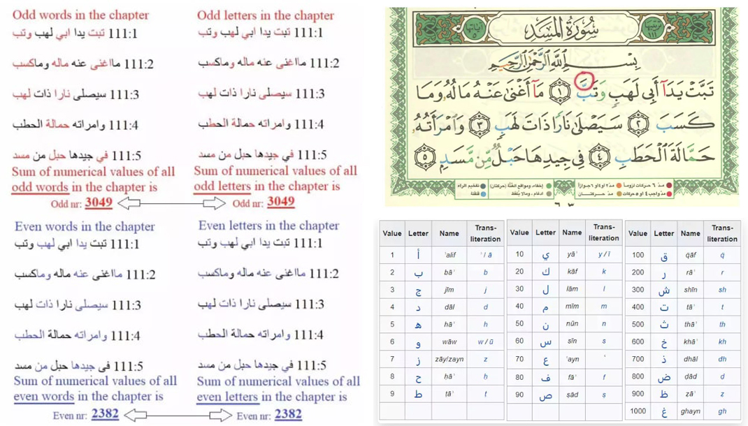 Cette pratique, loin d’être un simple divertissement intellectuel, a ouvert la voie à des analyses structurelles profondes, notamment dans l’étude du Coran. L’un des exemples les plus vertigineux de cette précision mathématique se trouve dans la 111ème sourate, intitulée Al-Massad ou les Fibres.