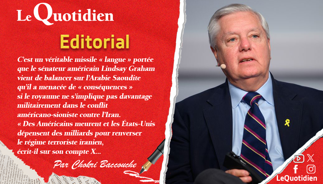 C’est un véritable missile « langue » portée que le sénateur américain Lindsay Graham vient de balancer sur l’Arabie Saoudite qu’il a menacée de « conséquences » si le royaume ne s’implique pas davantage militairement dans le conflit américano-sioniste contre l’Iran. « Des Américains meurent et les États-Unis dépensent des milliards pour renverser le régime terroriste iranien, écrit-il sur son compte X.